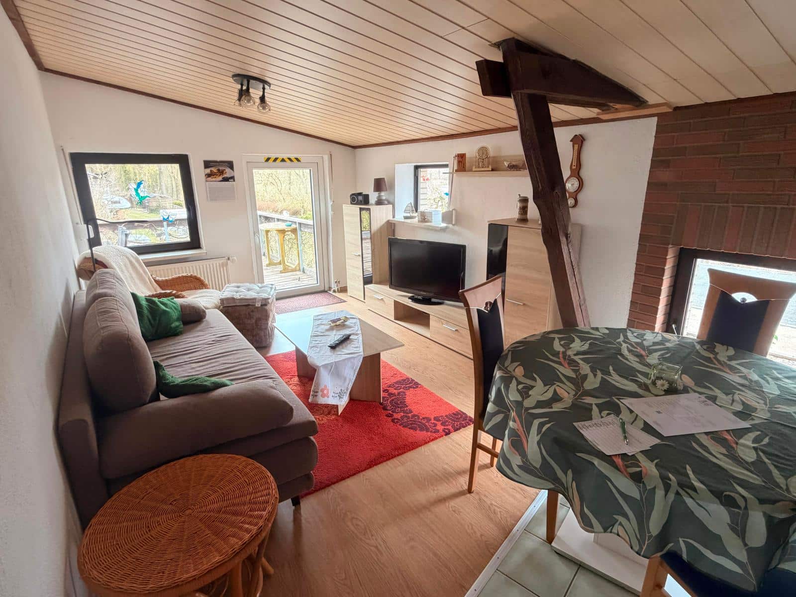 - Wohn-/Esszimmer mit Schlafcouch, Schrankbett, Esstisch & Fernseher
